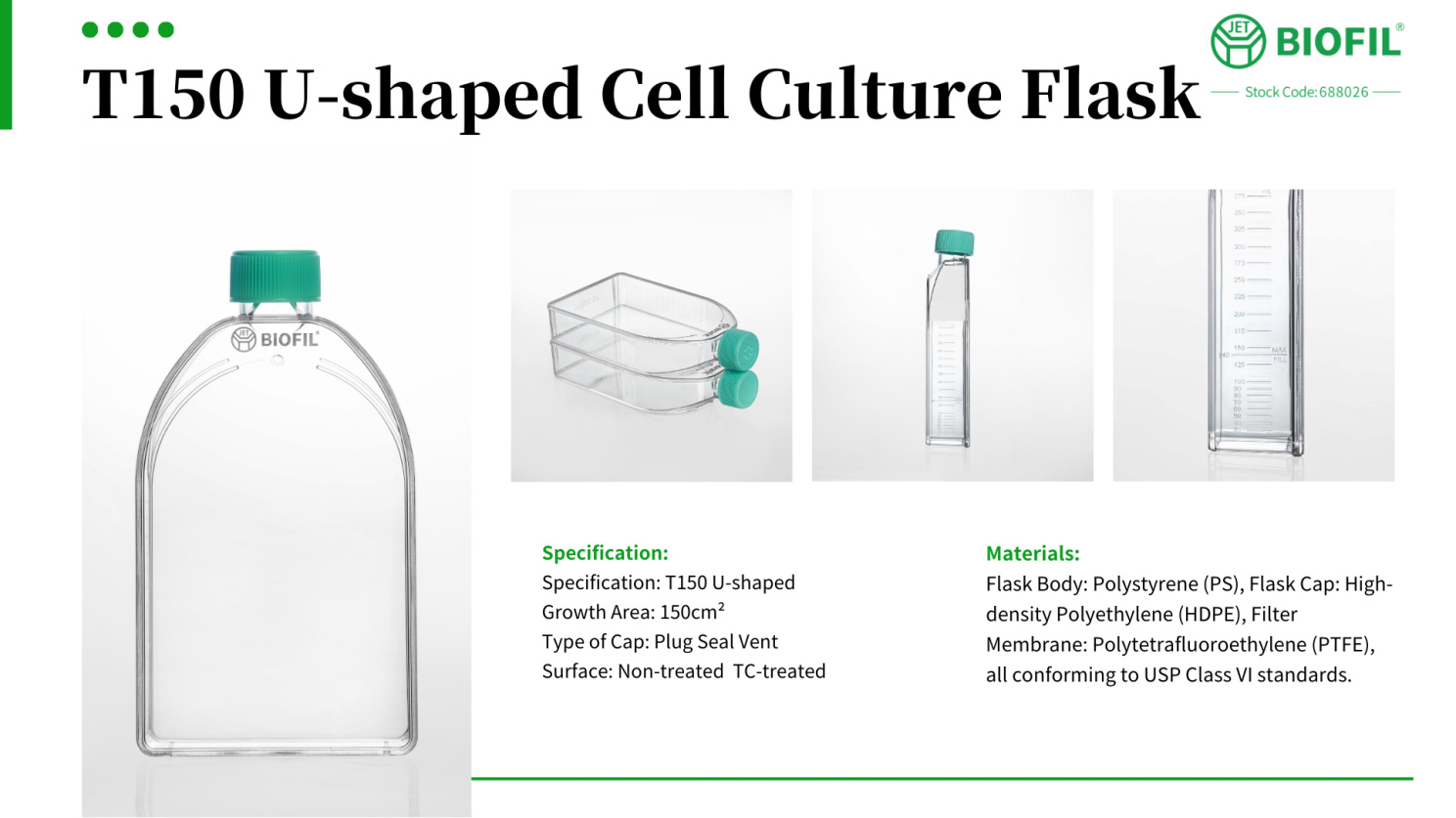 Cell culture flasks are one of the most widely used consumables by life science researchers in cell-based experiments and assays. Compared to common rectangular cell culture flasks, Jet Biofil’s T150 U-shaped cell culture flask features a rounded shoulder design that effectively reduces dead corners for pipettes and cell scraping tools, while also providing a more comfortable grip. This design enhancement ensures efficient cell harvesting processes and a more ergonomic tissue culture experience for researchers, without compromising cell growth capabilities.