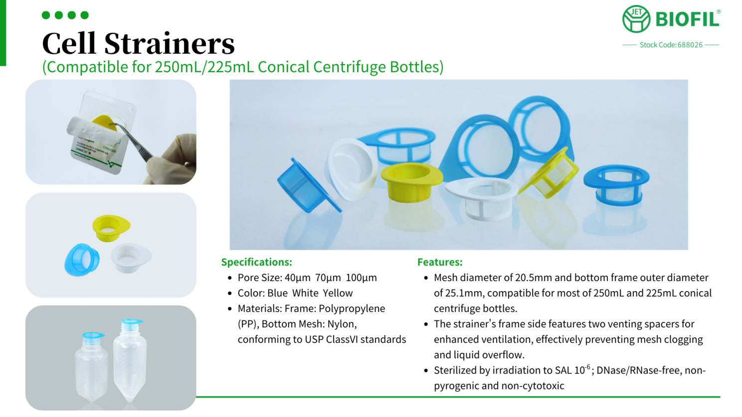 Designed for use with 250 mL and 225 mL conical centrifuge bottles, our new cell strainer feature an enclosed frame side and a mesh bottom structure. The mesh has a diameter of 20.5 mm, while the outer diameter of the bottom frame measures 25.1 mm. Although specifically tailored for Jet Biofil's conical bottles, these strainers are compatible with most similar bottles available on the market. The frame side is equipped with two venting spacers to enhance airflow, effectively preventing mesh clogging and liquid overflow.