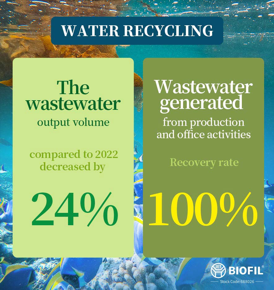 In 2023, JET Biofil achieved a 24% reduction in wastewater generated from office production activities compared to 2022, with 100% of the wastewater being collected, treated, and reused through municipal sewage networks.